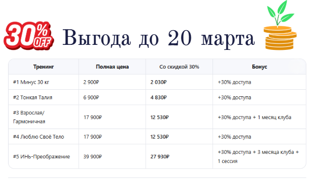 4 вебинара, в которых Вы получаете здоровскую взбучку для самых проблемных убеждений и заморочек, благодаря этой совместной работе Ваш настрой будет на уровне Эвереста, а талия все ближе к пупку