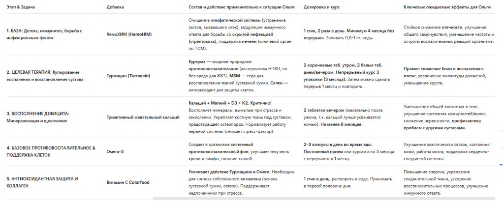 Ольга, ты уже сделала первый и самый важный шаг — начала ХемоХИМ. Теперь добавь к нему «ремонтную бригаду» (Турмацин) и «стройматериалы» (Кальций). Веди дневник. Система не подведет. Твое плечо — это не изолированная проблема, а сигнал всего организма. Давая телу правильные инструменты для очищения и восстановления, ты решаешь не только вопрос с болью, а создаешь ресурс для здоровья на годы вперед.